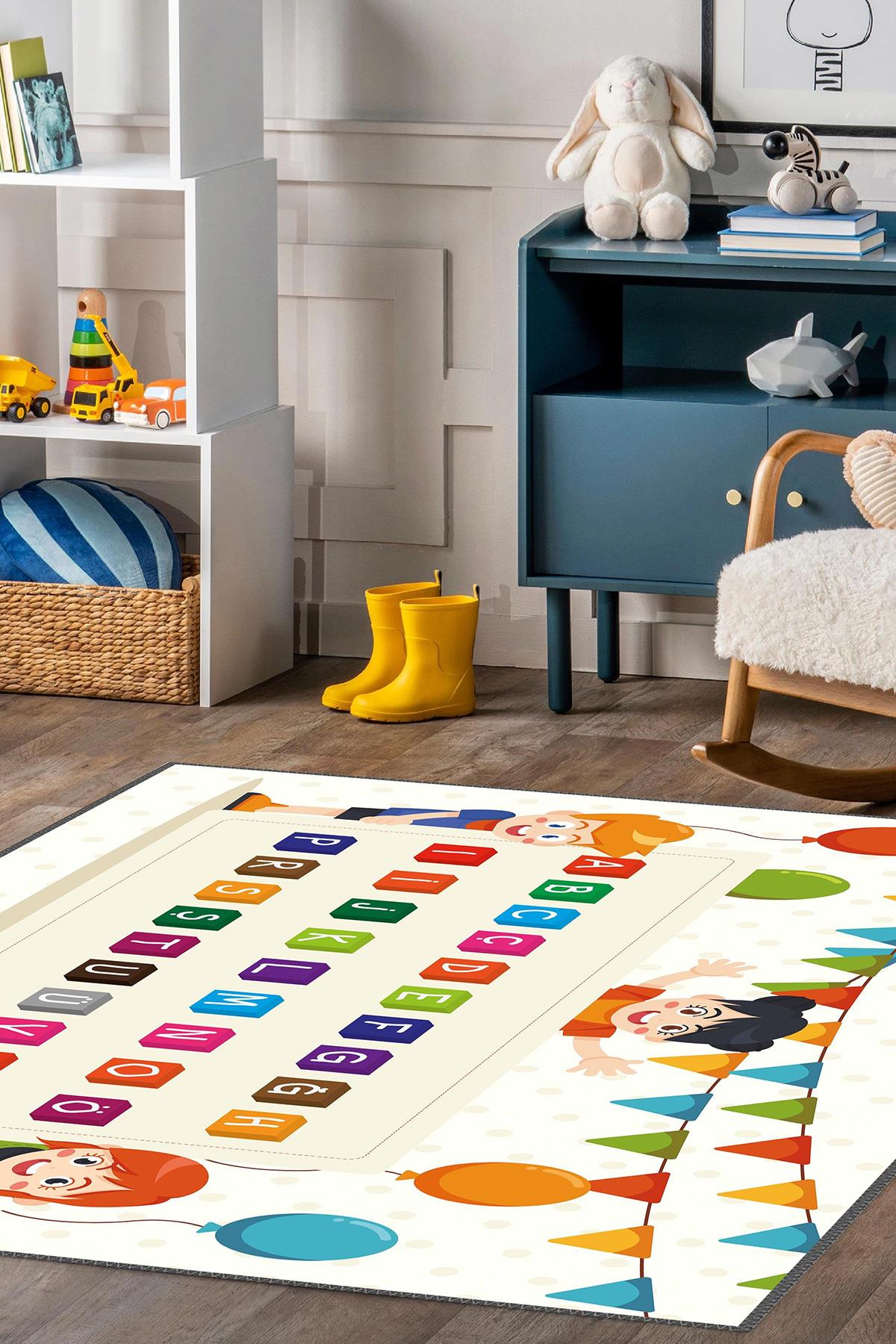 Alfabe Baskılı Kaymaz Tabanlı Makinede Yıkanabilir Çocuk Halısı