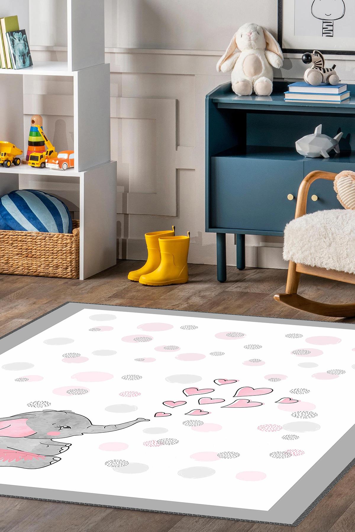Beyaz Gri Fil Baskılı Kaymaz Tabanlı Makinede Yıkanabilir Çocuk Halısı