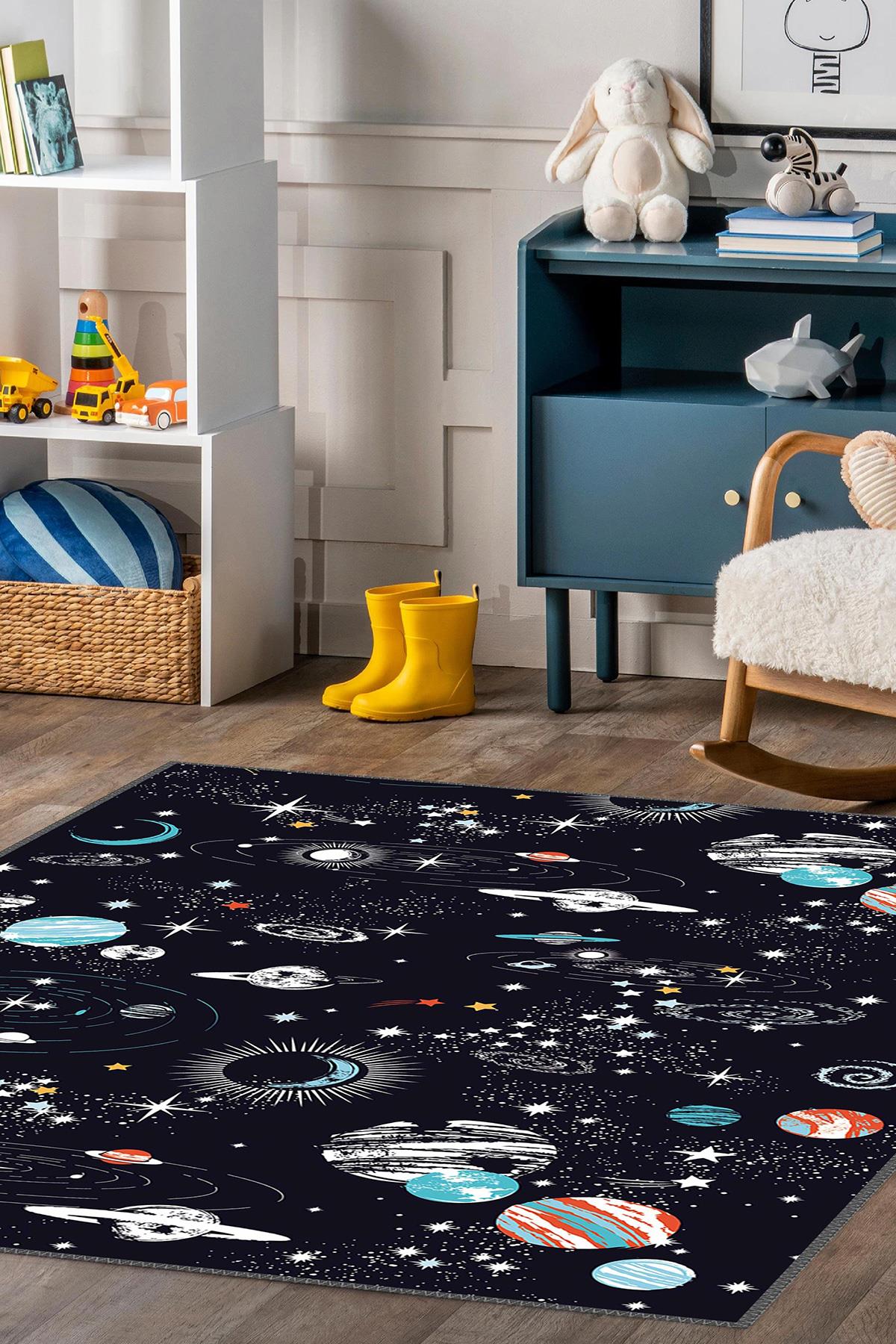Galaksi Baskılı Kaymaz Tabanlı Makinede Yıkanabilir Çocuk Halısı (Cc-çocuk27)