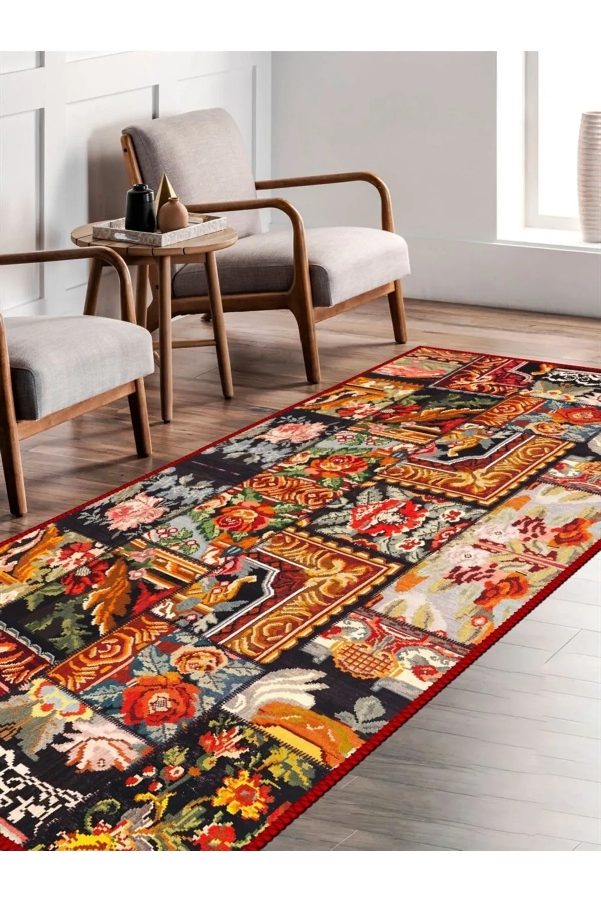 Serteks dijital baskı kilimleri toz, kir ve suya karşı dayanıklı tüysüz yüzeye, antialerjik hav yapmayan dokuya sahiptir. ; Kilimlerimiz antialerjik ve anti bakteriyel özelliğe sahip olup son teknoloji makinelerde özenle üretilmiştir. ; Halılarımız M2 de 1500 gr ağırlığına sahiptir. ; %85 yıkanmış pamuk ve %15 süngerli kadife kumaş kullanılarak üretilmiştir. ; Desenlerimiz günümüz modasına uygun vintage, modern ve çeşitli tarzlara uygun ünlü tasarımcılar tarafından tasarlanmıştır. ; Ürünlerimiz insan sağlığına zararlı madde içermez. ; • Halılarımızı ev akarlarına karşı alerjisi olan kişiler ve astım hastaları rahatlıkla kullanabilmektedir. ; • tüy tutmama özelliğine sahip olduğu için evcil hayvan sahipleri için kullanıma uygundur. ; • Çamaşır makinesinde 30° Derecede sıkma yapmadan hassas yıkama ayarında yıkanabilmektedir. ; • Elde doğal halı şampuanı ile yıkanabilir. ; • Robot süpürge kullanımına uygundur. ; Ilık ve sabunlu suyla silinebilmektedir. ; • Kurutma makinası kullanılmamalıdır. ; • Gölgede kurutulması tavsiye edilmektedir. ; • Direk güneşte kurutmak renk solmasına sebebiyet verebilmektedir. ; • Tabanı dökülme ve koku yapmaz özelliktedir.;