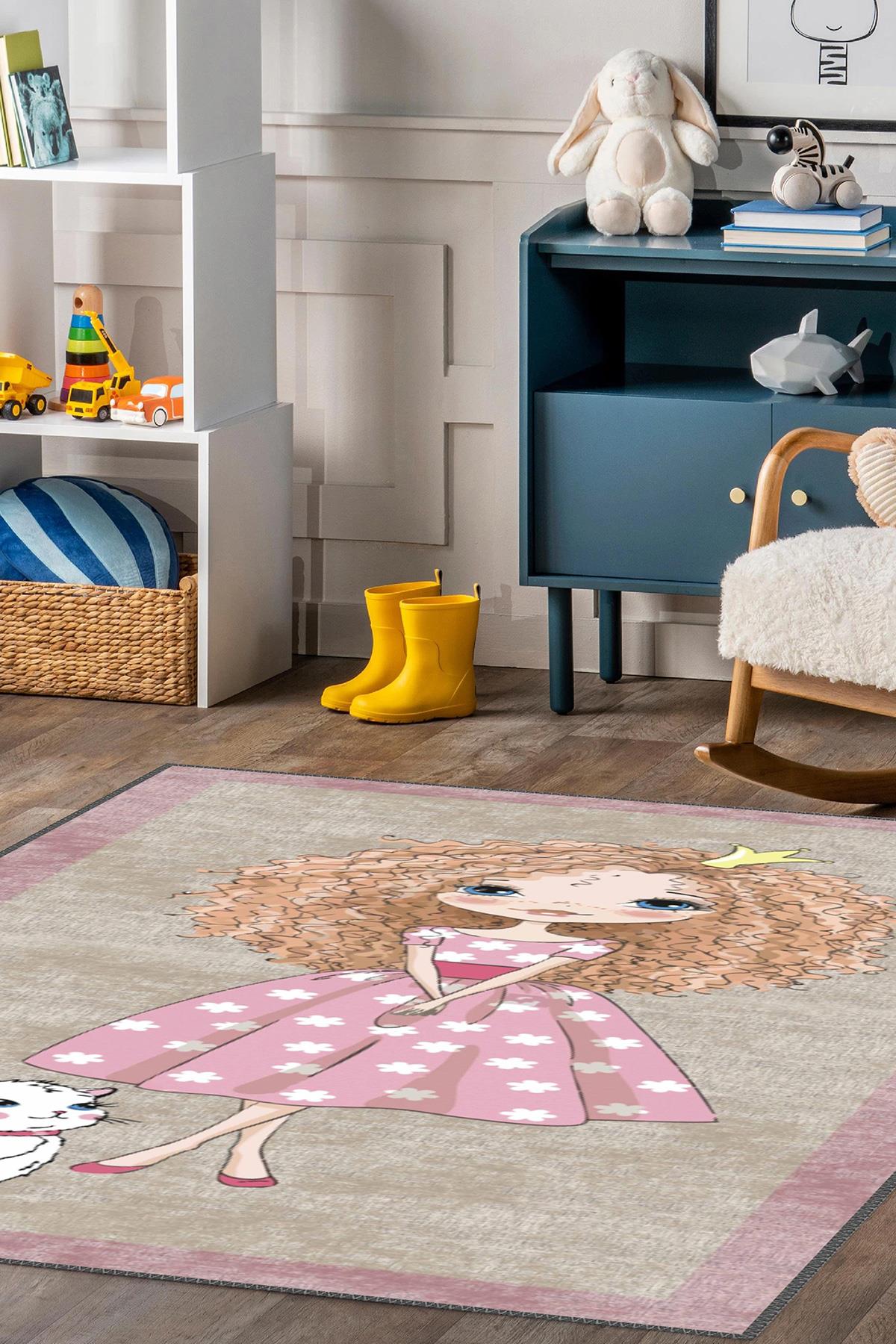 Pembe Beyaz Baskılı Kaymaz Tabanlı Makinede Yıkanabilir Çocuk Halısı (Cc-çocuk24)