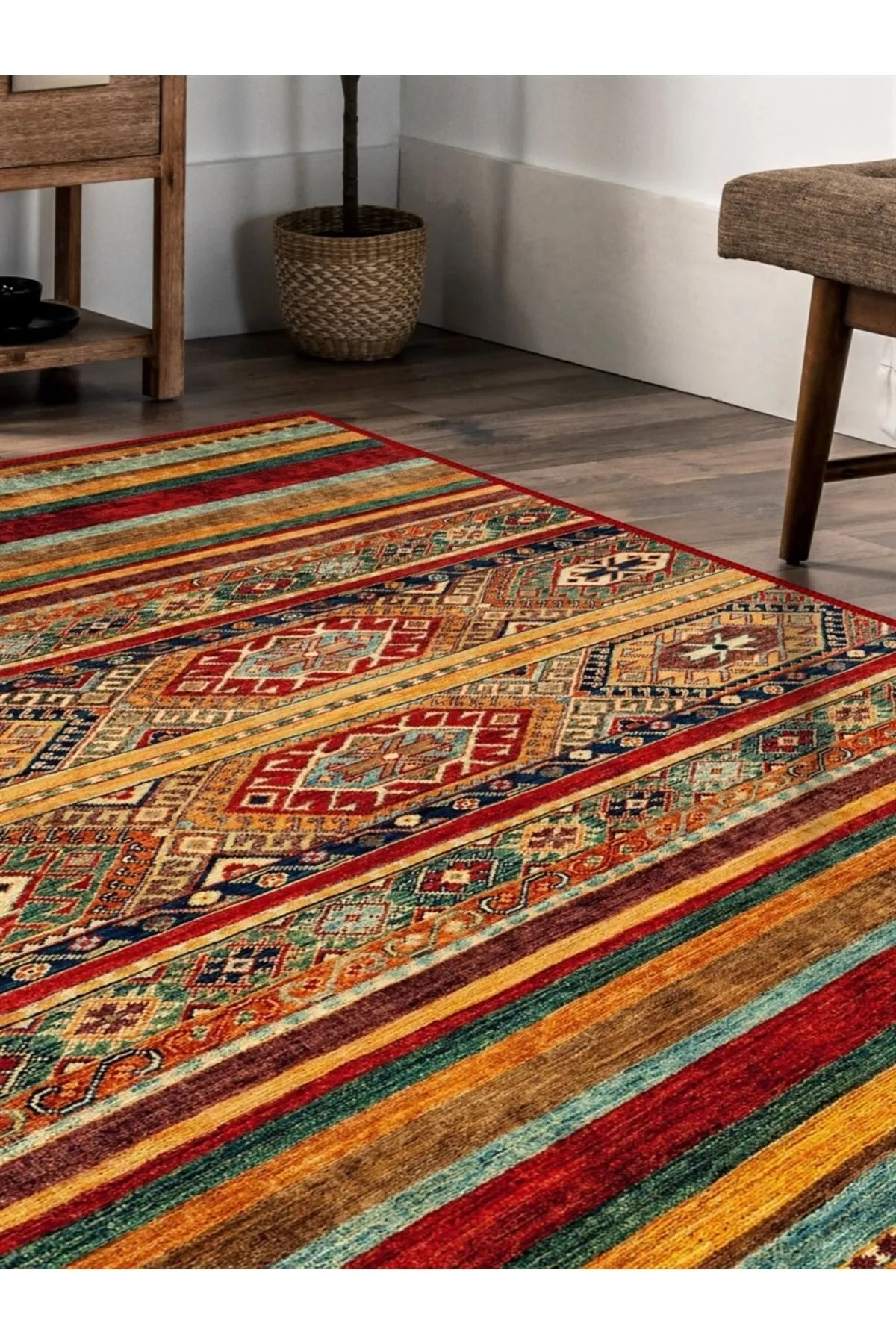 Serteks dijital baskı kilimleri toz, kir ve suya karşı dayanıklı tüysüz yüzeye, antialerjik hav yapmayan dokuya sahiptir. ; Kilimlerimiz antialerjik ve anti bakteriyel özelliğe sahip olup son teknoloji makinelerde özenle üretilmiştir. ; Halılarımız M2 de 1500 gr ağırlığına sahiptir. ; %85 yıkanmış pamuk ve %15 süngerli kadife kumaş kullanılarak üretilmiştir. ; Desenlerimiz günümüz modasına uygun vintage, modern ve çeşitli tarzlara uygun ünlü tasarımcılar tarafından tasarlanmıştır. ; Ürünlerimiz insan sağlığına zararlı madde içermez. ; • Halılarımızı ev akarlarına karşı alerjisi olan kişiler ve astım hastaları rahatlıkla kullanabilmektedir. ; • tüy tutmama özelliğine sahip olduğu için evcil hayvan sahipleri için kullanıma uygundur. ; • Çamaşır makinesinde 30° Derecede sıkma yapmadan hassas yıkama ayarında yıkanabilmektedir. ; • Elde doğal halı şampuanı ile yıkanabilir. ; • Robot süpürge kullanımına uygundur. ; Ilık ve sabunlu suyla silinebilmektedir. ; • Kurutma makinası kullanılmamalıdır. ; • Gölgede kurutulması tavsiye edilmektedir. ; • Direk güneşte kurutmak renk solmasına sebebiyet verebilmektedir. ; • Tabanı dökülme ve koku yapmaz özelliktedir.;